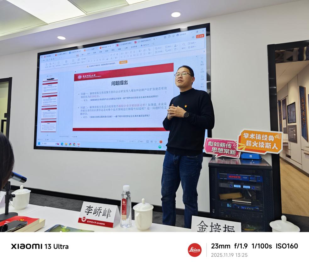 在专题研讨环节,金培振及金融学系教工党支部宣传委员张玉鹏紧扣党的二十届四中全会精神、习近平经济思想,聚焦学科前沿及国家和区域战略需求,从研究背景、研究方法、研究发现等方面分享近期学术思考和研究成果。金培振副教授以“聚散亦有道:生产性服务业集聚何以赋能城际技术扩散”为主题,围绕党的二十届四中全会关于构建转化高效的技术市场的战略部署,深入分析生产性服务业集聚推动城际技术转移的内在机制,并讨论集聚格局重塑城市在创新网络中的位置与分工的作用机理。张玉鹏作“碳排放权交易政策能有效推动企业创新吗”主题报告,重点探讨碳排放权交易制度对企业突破式创新与渐进式创新的差异化激励效应,以及由此引致的经济福利变化。在场党员围绕服务业集聚的实证方法、碳排放权交易的政策落地等报告内容展开热烈讨论。研讨不仅涉及学术主题,还延伸至如何将习近平经济思想、学科大师精神融入科研育人实践。