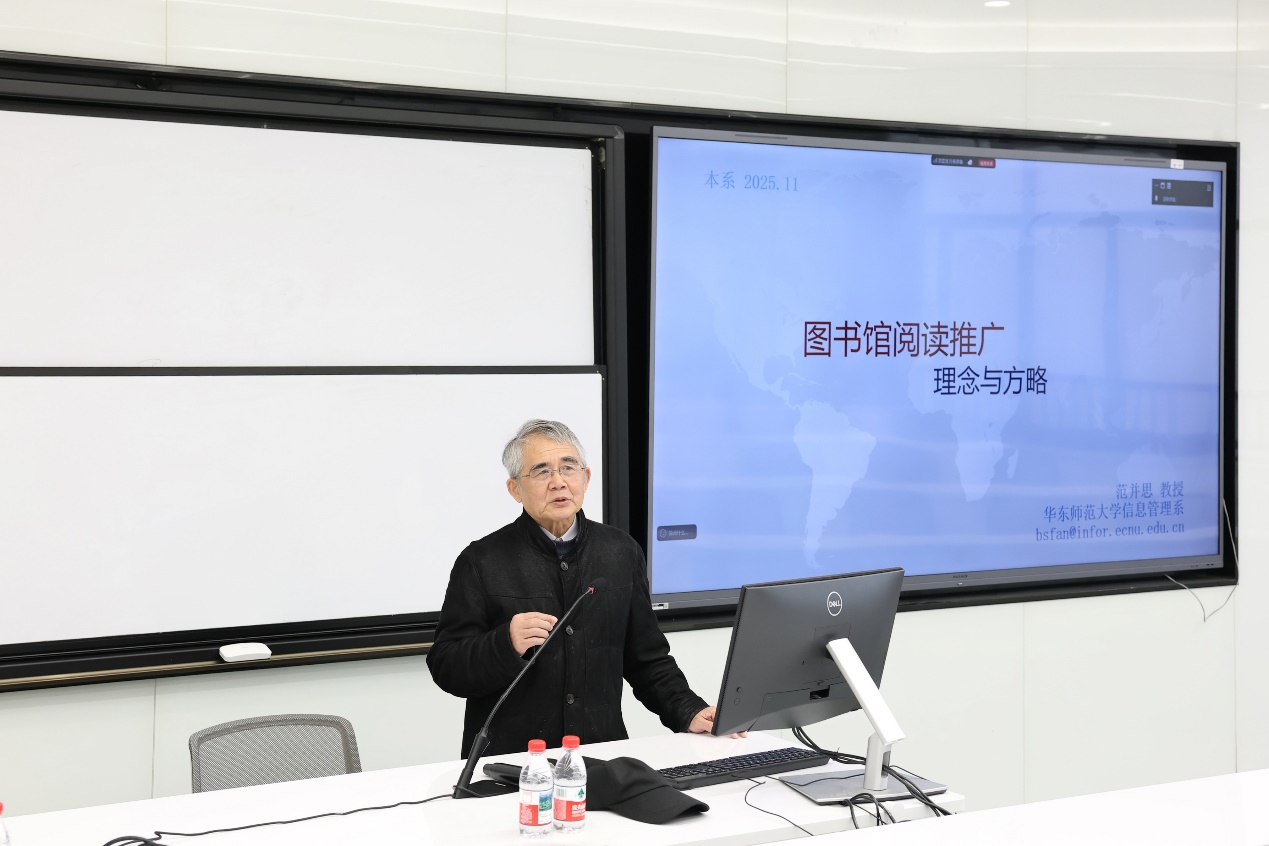 2025年11月24日,第42期经管双周论坛邀请了华东师范大学经济与管理学院范并思教授来做报告。此次报告主题为《图书馆阅读推广:理论与方略》,由信息管理系主任蔚海燕老师主持,吸引了经济与管理学院、上海图书馆、华东师范大学图书馆的师生和馆员50余人参加。