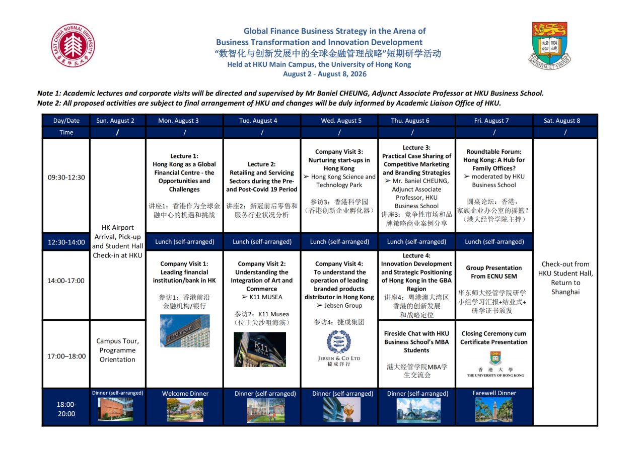 »具体安排为:8月2日(周日)抵达香港国际机场,前往香港大学、入住港大学生公寓(单人间);8月3日(周一)至8月7日(周五)在香港大学主校区进行课程学习、企业参访、圆桌论坛、学生座谈交流、研学汇报等活动;8月8日(周六)返回上海。