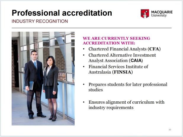 若申请人选择Master of Commerce商科硕士(含金融、金融科技专业方向),将与麦考瑞大学商学院当地学生一起修读5门核心课程(共80学分点),具体含必修课3门:《商业道德与可持续发展》、《数据管理、商学分析与革新》、《当代商业问题》,通识限选课1门:《商业决策中的管理会计学》或《商业数据分析与技术》或《全球化与供应链管理》等,专业限选课1门:《金融科技》或《人力资源管理》或《市场营销》或《会计与审计》或《金融》等。